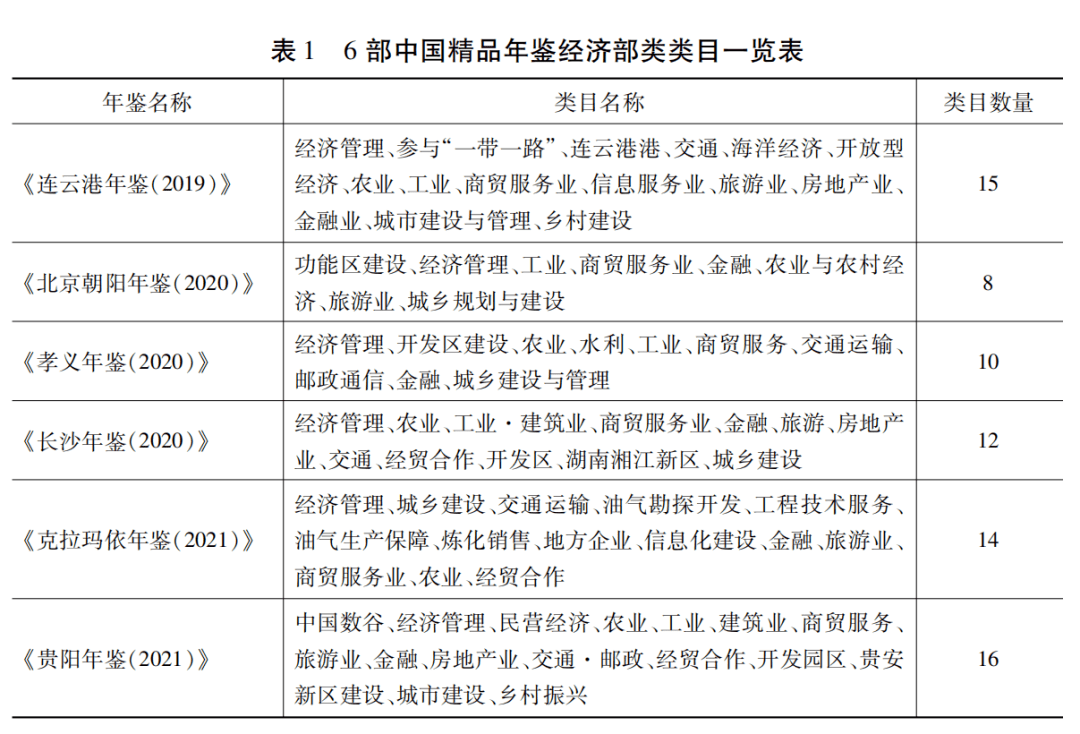 一是收录资料翔实丰富、记述范围全面系统。“横分门类不缺项”是地方综合年鉴内容收录应该把握的原则,梳理6部中国精品年鉴经济部类的类目设置情况(见表1),可以发现,经济部类的类目覆盖广泛。《连云港年鉴(2019)》设置15个类目,《北京朝阳年鉴(2020)》设置8个类目,《孝义年鉴(2020)》设置10个类目,《长沙年鉴(2020)》设置12个类目,《克拉玛依年鉴(2021)》设置14个类目,《贵阳年鉴(2021)》设置16个类目,且均涵盖了经济管理、经济合作、招商引资、对外经济、开发区、第一产业、第二产业、第三产业、城乡建设等内容,对应范围的主要领域没有重大漏项,较为全面、系统、翔实地反映了该区域的经济发展情况。