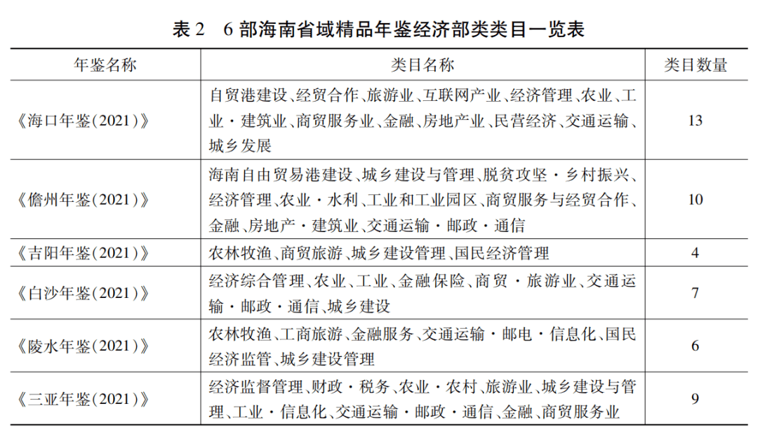 一是资料收录总体较为全面,但存在个别缺项。6部海南省域精品年鉴在经济部类内容类目设置上(见表2),《海口年鉴(2021)》设置13个类目,《儋州年鉴(2021)》设置10个类目,《吉阳年鉴(2021)》设置4个类目,《白沙年鉴(2021)》设置7个类目,《陵水年鉴(2021)》设置6个类目,《三亚年鉴(2021)》设置9个类目。总体来看,6部海南省域精品年鉴类目设置大体上能覆盖经济部类相关内容,但与前述6部中国精品年鉴相比,类目数量偏少,且个别存在缺项,如除《儋州年鉴(2021)》将产业园区设为类目,其余年鉴均未设置相关类目;《吉阳年鉴(2021)》没有第二产业及金融业类目;6部海南省域精品年鉴对经贸合作、对外经济内容记述偏少,仅有2部年鉴有相关内容等。