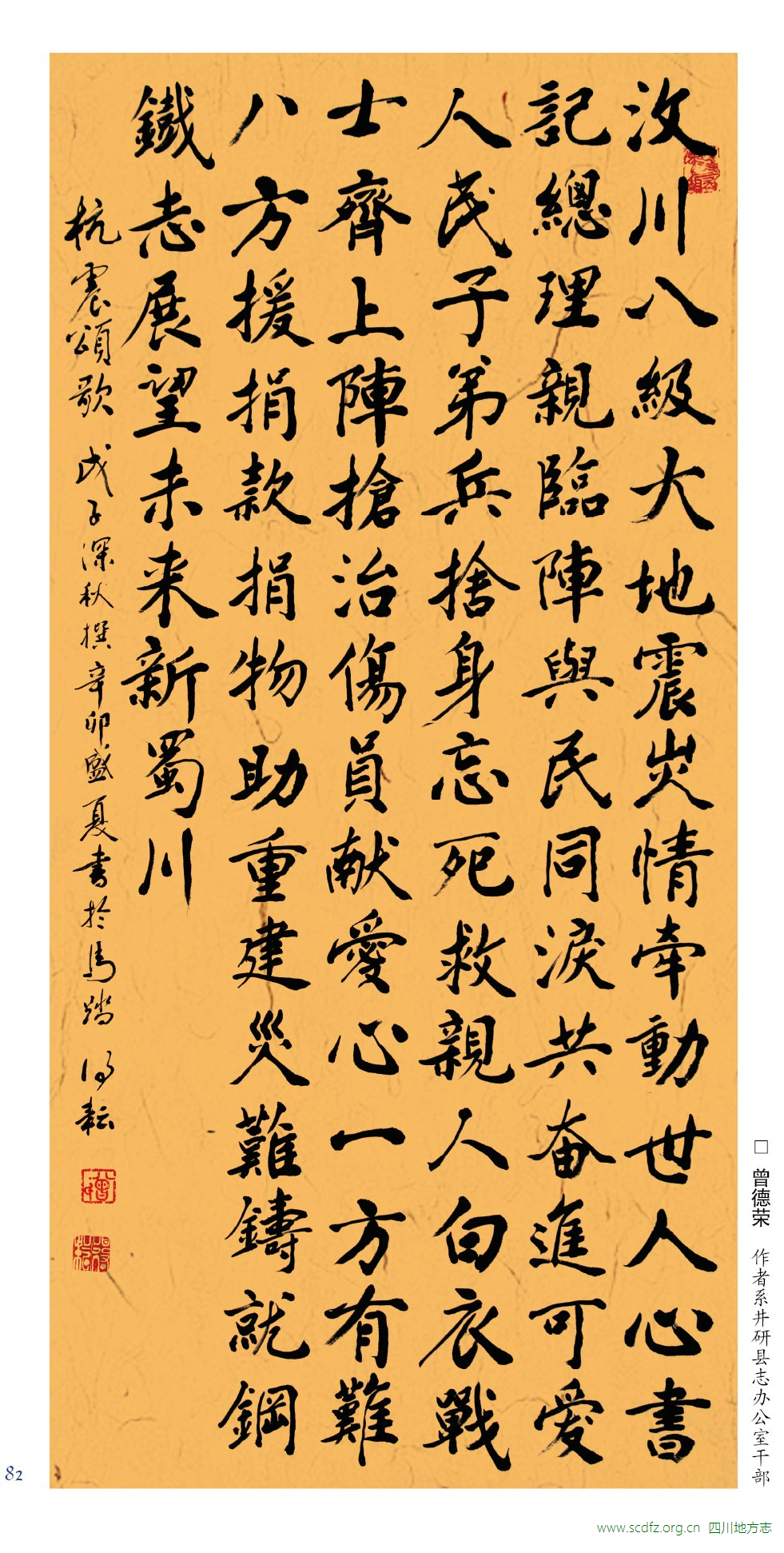 曾德荣 诗作暨书法《抗震颂歌》 作者:曾德荣,井研县地方志办公室 来源:《四川方志艺苑》 发布时间:2017-02-23 15:54:00 浏览次数: 次 【字体:小 大】 曾德荣诗作暨书法《抗震颂歌》 来源: 《四川方志艺苑》 分享到: 关闭本页 【打印正文】