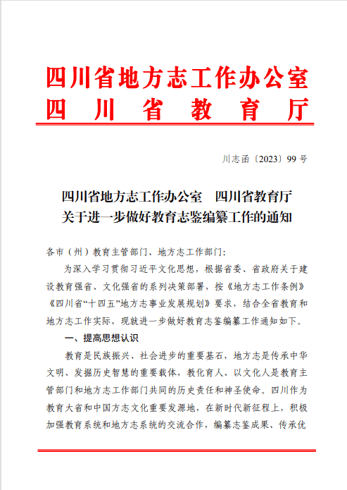 二是强制度安排。2023年11月,教育厅、省地方志办联合印发《》,对全省教育志鉴编纂工作的组织架构和工作机制作出明确安排,针对实际就队伍建设、制度健全、目标确立、经费保障、督促检查、评价考核等作出规定。截至2025年4月25日,成都、自贡、泸州、德阳、广元、遂宁、内江、乐山、宜宾、广安、达州、巴中、雅安、眉山、阿坝15个市(州)联合教育部门制发文件,安排部署教育志鉴编修工作,形成工作制度。