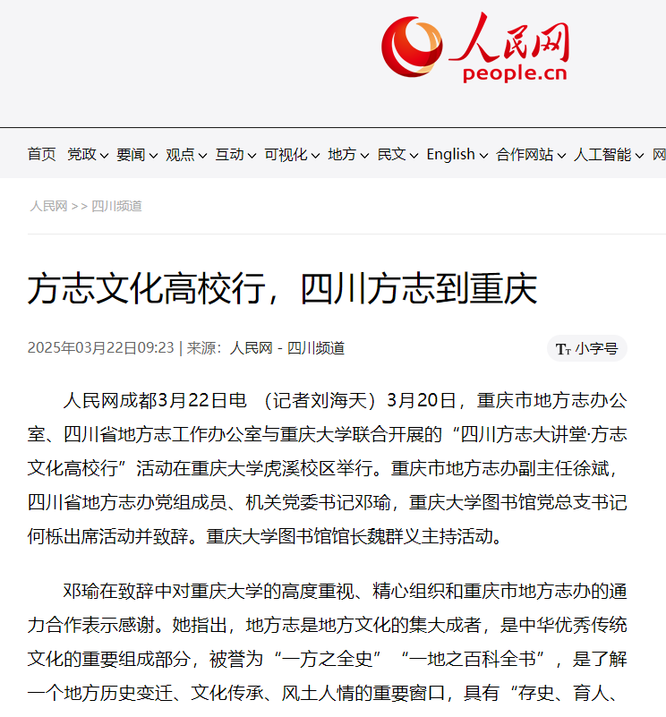人民网成都3月22日电 (记者刘海天)3月20日,重庆市地方志办公室、四川省地方志工作办公室与重庆大学联合开展的“四川方志大讲堂·方志文化高校行”活动在重庆大学虎溪校区举行。重庆市地方志办副主任徐斌,四川省地方志办党组成员、机关党委书记邓瑜,重庆大学图书馆党总支书记何栎出席活动并致辞。重庆大学图书馆馆长魏群义主持活动。