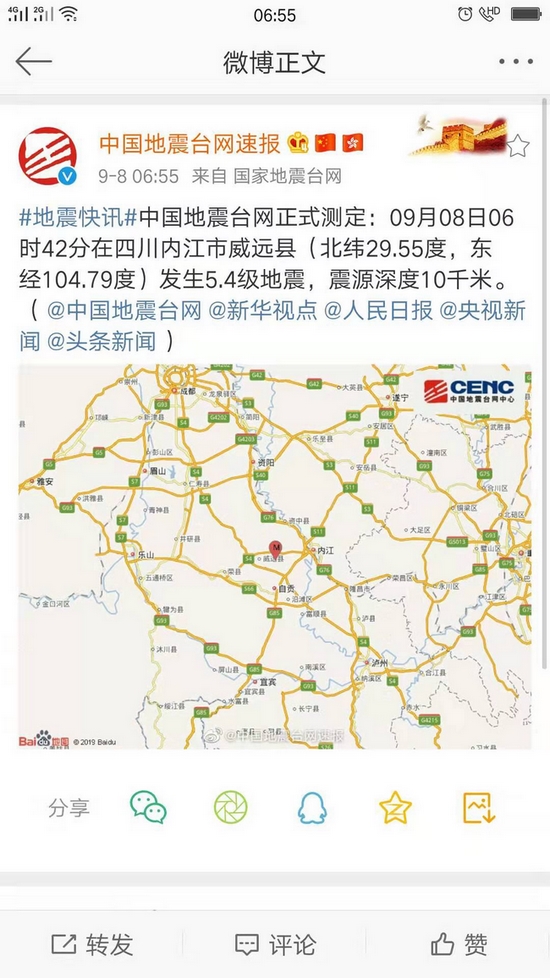 四川在线消息:据中国地震台网正式测定:09月08日06时42分在四川内江市威远县(北纬29.55度,东经104.79度)发生5.4级地震,震源深度10千米。