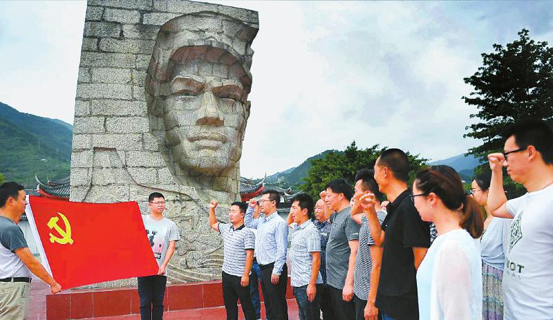 位于石棉县的安顺场中国工农红军强渡大渡河纪念碑前,党员干部在党旗前宣誓,开展﹃不忘初心、牢记使命﹄主题教育。本报记者衡昌辉摄(资料图片)