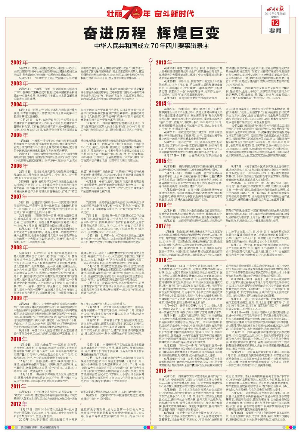 四川是中华人民共和国70年奋进历程与辉煌成就的一个鲜活缩影。从社会主义革命到社会主义建设,从改革开放到中国特色社会主义新时代,四川各族人民以前所未有的热情积极投身壮丽恢宏的历史实践,创造了一系列敢为天下先的壮举,谱写了一部部荡气回肠的新篇。为使全省各族人民在实现“两个一百年”奋斗目标进程中进一步凝聚继续前行的磅礴动力,奋力推动治蜀兴川再上新台阶,实现中华民族伟大复兴的中国梦,省委党史研究室、省地方志工作办公室专门梳理出中华人民共和国成立70年来四川经济社会发展的大事、要事。四川日报特予刊发,以飨读者。