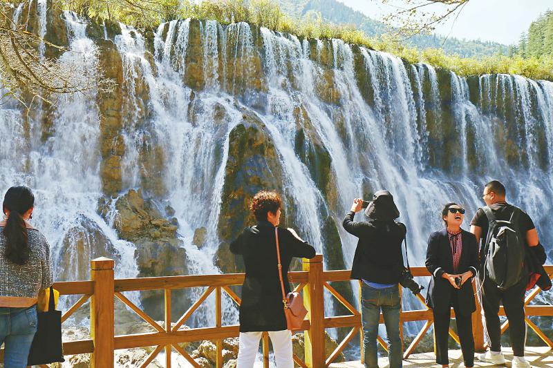 阳光下,游客说着笑着,呼朋引伴。来自山西太原的李凤英和几位同伴穿上艳丽的民族服装,牵着横幅拍照,她们齐喊:“我在九寨沟祝福祖国繁荣富强。”她们感叹,九寨沟景色太美了,不虚此行。