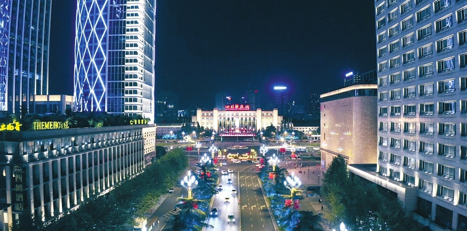 成都,锦江旁,339天府熊猫塔塔身,绚丽的红色光束穿透夜空;往东,220公里外的南充,嘉陵江畔,一栋栋建筑外立面山水图和“中国红”交相辉映;北边,“中国科技城”绵阳,180000枚流动的彩灯绘出绚烂图景;再往南,乐山,岷江、青衣江、大渡河三江汇流的大佛脚下,大型声光秀正在上演。
