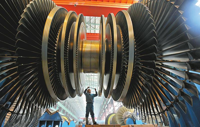 灾后恢复重建后,德阳东汽职工正在大型汽轮机上安装配件。