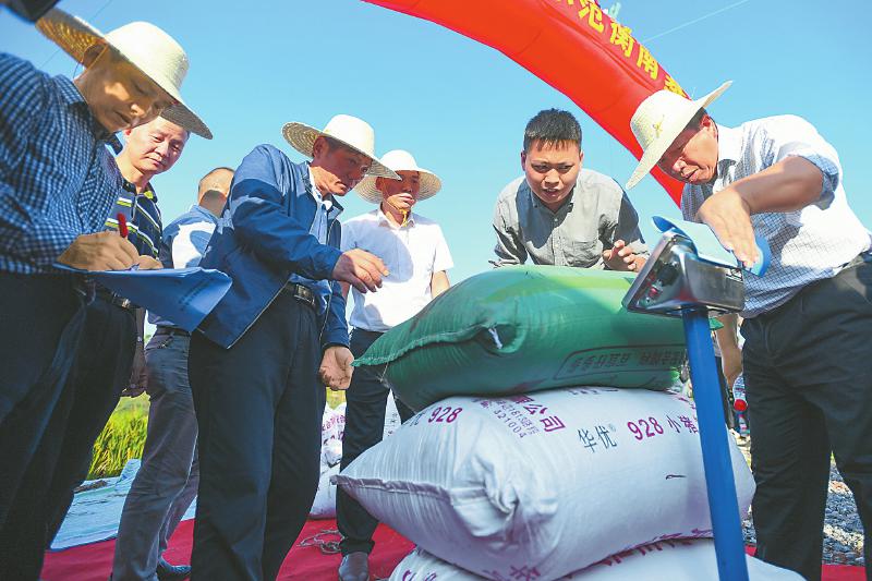 工作人员在第三代杂交水稻新组合试验示范衡南基地测产现场称重。 新华社记者 陈泽国 摄