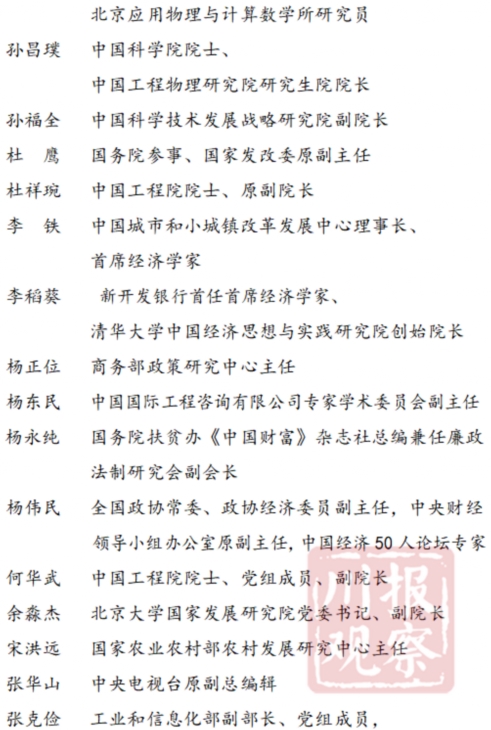 44名同志中,省部级领导10人,中国经济50人论坛专家6人,“两院”院士8人,其他高端智库专家学者20人,涉及政治、经济、文化、社会、生态等领域,涵盖了宏观经济、产业经济、区域经济、数字经济、科技创新、对外开放、基础设施、金融财税、文化旅游、“三农”工作、乡村振兴等方面。