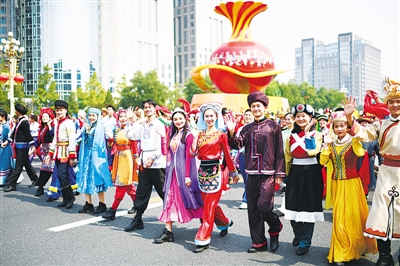 10月1日上午,庆祝中华人民共和国成立70周年大会在天安门广场隆重举行。图为民族团结方阵。新华社发