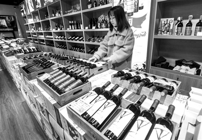 义乌中国进口商品城内工作人员摆放刚刚运抵的进口红酒。新华社发