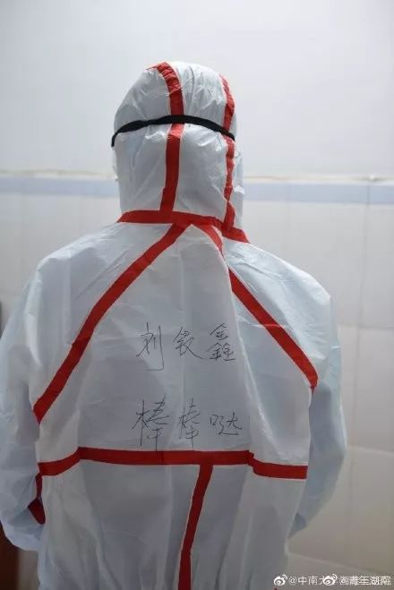因为穿了隔离衣认不清谁是谁, 医护人员互相在 背后写上了名字并打气: 加油! 棒棒哒!