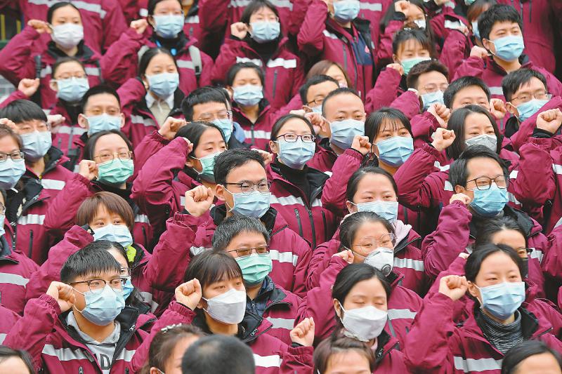 2月7日,四川省第五批援助湖北医疗队出征,四川大学华西医院的队员们在出征仪式上宣誓。 本报记者郝飞摄