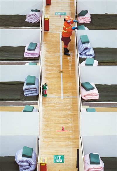 2月12日,工人在即将开放的方舱医院进行整理和清洁工作。 新华社记者 肖艺九摄