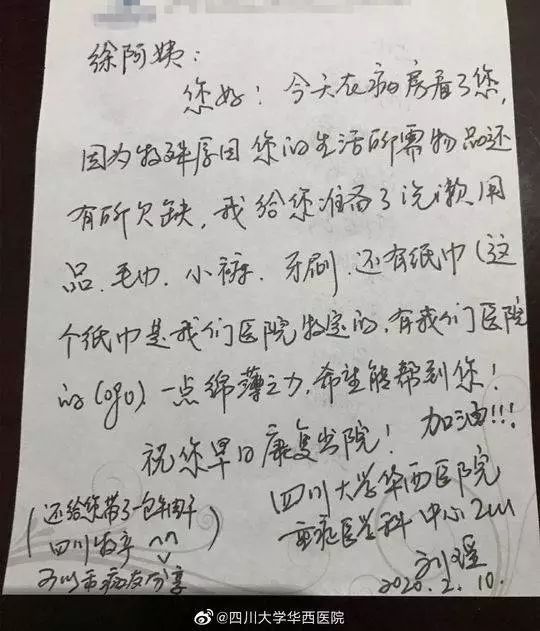在武汉大学人民医院东院重症病房,第二批援鄂医疗队队员刘瑶为一位患者阿姨带去了一袋“礼物”,里面是纸巾、毛巾、牙刷、润肤霜、沐浴露等生活用品。原来,在前一天查房时,她发现这位患者因为家人被隔离,暂时连一些基础生活用品都没有。回到住处后,刘瑶将自己还未用过的生活用品打包,附上小纸条:“给您准备了洗漱用品,还有医院定制的纸巾,还有四川特产牛肉干,一点绵薄之力,希望能帮到您!”