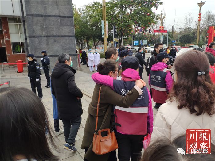 来自广元精神卫生中心的内科护士杨娟早上5点多就起床了,含泪亲了亲熟睡的两个儿子,在丈夫的陪伴下,来到集合点。“小儿子才1岁多,肯定舍不得,想他的时候就视频吧。”