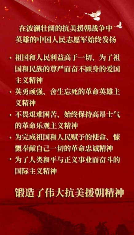 习近平总书记指出:“抗美援朝战争锻造形成的伟大抗美援朝精神,是弥足珍贵的精神财富,必将激励中国人民和中华民族克服一切艰难险阻、战胜一切强大敌人。”伟大的抗美援朝精神,是中国共产党人和人民军队崇高风范的生动写照,是中华民族传统美德和民族品格的集中展示,是以爱国主义为核心的民族精神的具体体现。我们在面对发展进程中层出不穷的重大挑战、重大风险、重大阻力、重大矛盾,必须始终高擎抗美援朝精神这面旗帜,牢牢把准新时代伟大斗争方向,坚持中国共产党领导和我国社会主义制度不动摇,在各种重大斗争考验面前“不畏浮云遮望眼”“乱云飞渡仍从容”。中国人民背负着历史的烙印,从历史中走过来,正在创造新时代属于自己的历史。展望中华民族伟大复兴的光明前景,我们无比坚定、无比自信。在曾经取得、当下创造和未来规划中的美好前景中,我们正向着全面建设社会主义现代化国家新征程,向着实现中华民族伟大复兴的中国梦,继续奋勇前进。在我们心中不断回荡的,正如电影《上甘岭》插曲《我的祖国》所歌唱的:“这是强大的祖国,是我生长的地方。在这片温暖的土地上,到处都有和平的阳光。”