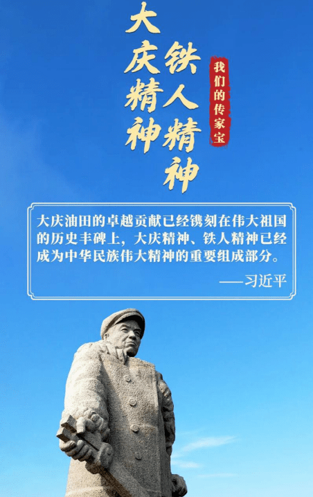 2019年9月,习近平总书记在致信祝贺大庆油田发现60周年时指出:“大庆油田的卓越贡献已经镌刻在伟大祖国的历史丰碑上,大庆精神、铁人精神已经成为中华民族伟大精神的重要组成部分。”