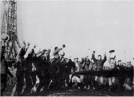 1959年,大庆油田工人欢呼第一口油井试喷成功。大庆油田的发现,结束了中国的油荒历史