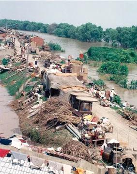 1998年夏,由于长江干流及鄱阳湖、洞庭湖水系,珠江、闽江和嫩江、松花江等江河相继发生特大洪水,导致江西、湖南、湖北、黑龙江、内蒙古、吉林等省(区)受灾严重。据统计,全国农田受灾面积达2229万公顷,倒塌房屋685万间,直接经济损失2551亿元。图为群众将家庭财产搬到大堤上躲避洪水