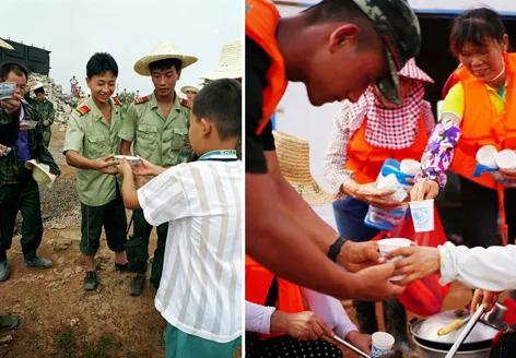 左图为1998年7月,江西永修学生为救灾官兵送水;右图为2020年7月,江西鄱阳江家岭村村民为前来抗洪抢险的武警官兵送上绿豆汤