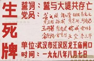 上图为1998年8月16日,河北武警战士在长江大堤上抢险;下图为1998年8月7日,湖北武汉龙王庙闸口守闸人员竖起的抗洪生死牌