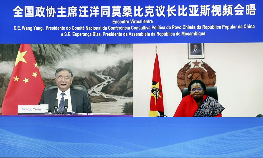 9月13日,全国政协主席汪洋在北京以视频方式会见莫桑比克议长比亚斯。新华社记者 刘卫兵 摄