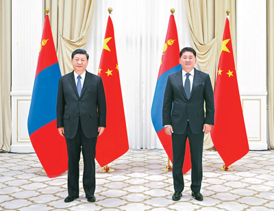 习近平强调,世界大势浩浩荡荡,和平与发展是各国人民共同期盼,单边主义、霸权行径、冷战思维终将在历史潮流中湮灭。中方始终坚持和平、发展、合作、共赢原则,坚持构建人类命运共同体。中蒙要坚持友好相待、守望相助、合作共赢,打造邻国关系典范。要加强战略沟通和政策协调,坚持相互尊重各自独立、主权和领土完整,坚持尊重两国人民自主选择的发展道路,坚定支持彼此核心利益和重大关切,维护好、巩固好双边关系发展的政治基础。中方愿同蒙方加强治国理政经验交流,加强“一带一路”倡议同“草原之路”倡议对接,推进中蒙俄经济走廊建设,落实全球发展倡议和全球安全倡议,支持蒙古国实现更好更快发展。中方支持蒙方“种植十亿棵树”计划,愿同蒙方积极开展防治荒漠化项目合作。
