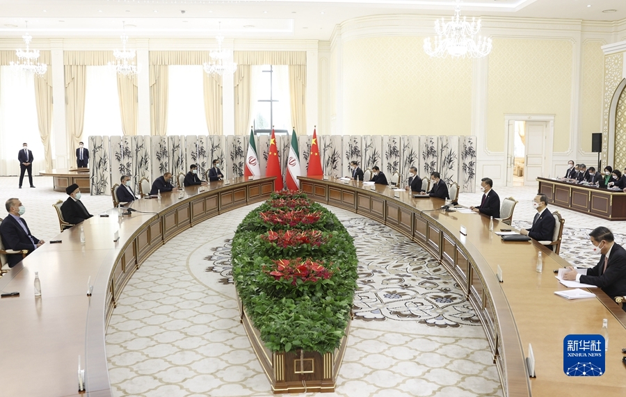当地时间9月16日上午,国家主席习近平在撒马尔罕国宾馆会见伊朗总统莱希。 新华社记者 申宏 摄