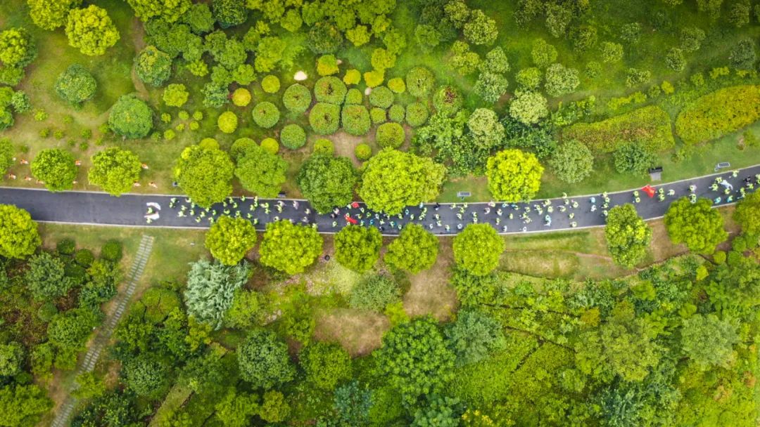 体育爱好者在江苏省淮安森林公园进行“全民健步走”活动 (干石泉 摄)