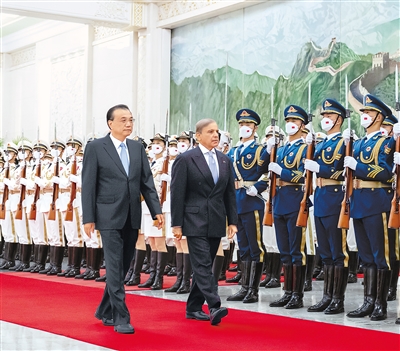 11月2日下午,国务院总理李克强在北京人民大会堂同来华进行正式访问的巴基斯坦总理夏巴兹举行会谈。这是会谈前,李克强在人民大会堂北大厅为夏巴兹举行欢迎仪式。 |