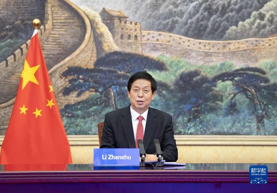 11月16日,全国人大常委会委员长栗战书在北京人民大会堂以视频方式同尼加拉瓜国民议会议长波拉斯举行会谈。新华社记者 李涛 摄