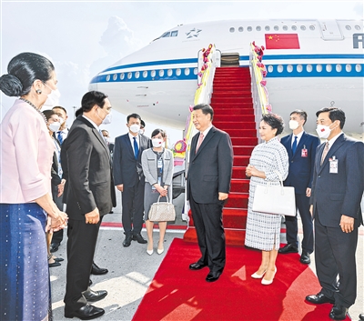 习近平和夫人彭丽媛乘坐的专机抵达曼谷素万那普国际机场时,泰国总理巴育夫妇、副总理兼外长敦夫妇、文化部部长伊提蓬夫妇等热情迎接。礼兵分列红地毯两侧,身着靓丽民族服装的当地青年行合十礼夹道欢迎,泰国华侨华人代表挥舞中泰两国国旗,向习近平夫妇表示最热烈的欢迎。