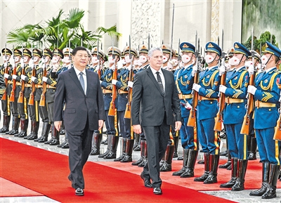 11月25日,中共中央总书记、国家主席习近平在北京人民大会堂同来华进行国事访问的古巴共产党中央委员会第一书记、古巴国家主席迪亚斯—卡内尔举行会谈。这是会谈前,习近平在人民大会堂北大厅为迪亚斯—卡内尔举行欢迎仪式。 |
