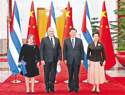 11月25日,中共中央总书记、国家主席习近平在北京人民大会堂同来华进行国事访问的古巴共产党中央委员会第一书记、古巴国家主席迪亚斯—卡内尔举行会谈。会谈前,习近平在人民大会堂北大厅为迪亚斯—卡内尔举行欢迎仪式。这是习近平和夫人彭丽媛同迪亚斯—卡内尔和夫人奎斯塔合影。 |