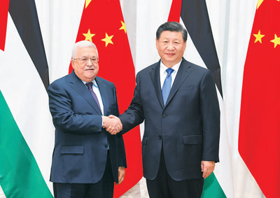 习近平指出,中巴友好深入人心。半个多世纪以来,双方始终相互信任,彼此支持。无论国际和地区形势如何变化,中方都坚定支持巴勒斯坦人民恢复民族合法权利的正义事业,始终同巴勒斯坦人民站在一起。国际社会应该把巴勒斯坦问题置于国际议程优先位置,坚持“两国方案”方向和“土地换和平”原则,在联合国有关决议和“阿拉伯和平倡议”基础上,推动重启和谈。中方将继续为推动巴勒斯坦问题早日得到公正持久解决不懈努力。