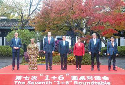12月9日,国务院总理李克强在安徽省黄山市同世界银行行长马尔帕斯、国际货币基金组织总裁格奥尔基耶娃、世界贸易组织总干事伊维拉、国际劳工组织总干事洪博、经济合作与发展组织秘书长科尔曼、金融稳定理事会主席诺特举行第七次“1+6”圆桌对话会。会议围绕“加强多边合作,促进全球共同发展”主题,就构建开放型世界经济、推动世界经济复苏和增长等议题深入交流。这是对话会开始前,李克强同主要国际经济机构负责人合影。 |