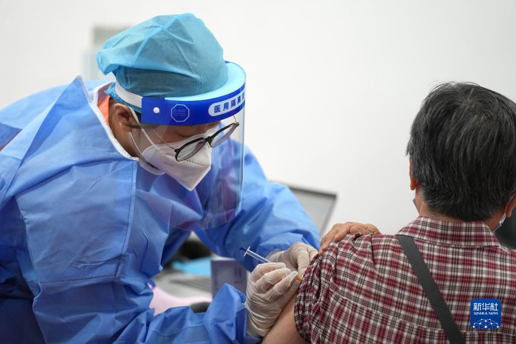 在北京市朝阳区奥运村街道一处新冠疫苗接种点,医护人员为一市民接种新冠疫苗加强针(2022年7月13日摄)。新华社记者 鞠焕宗 摄