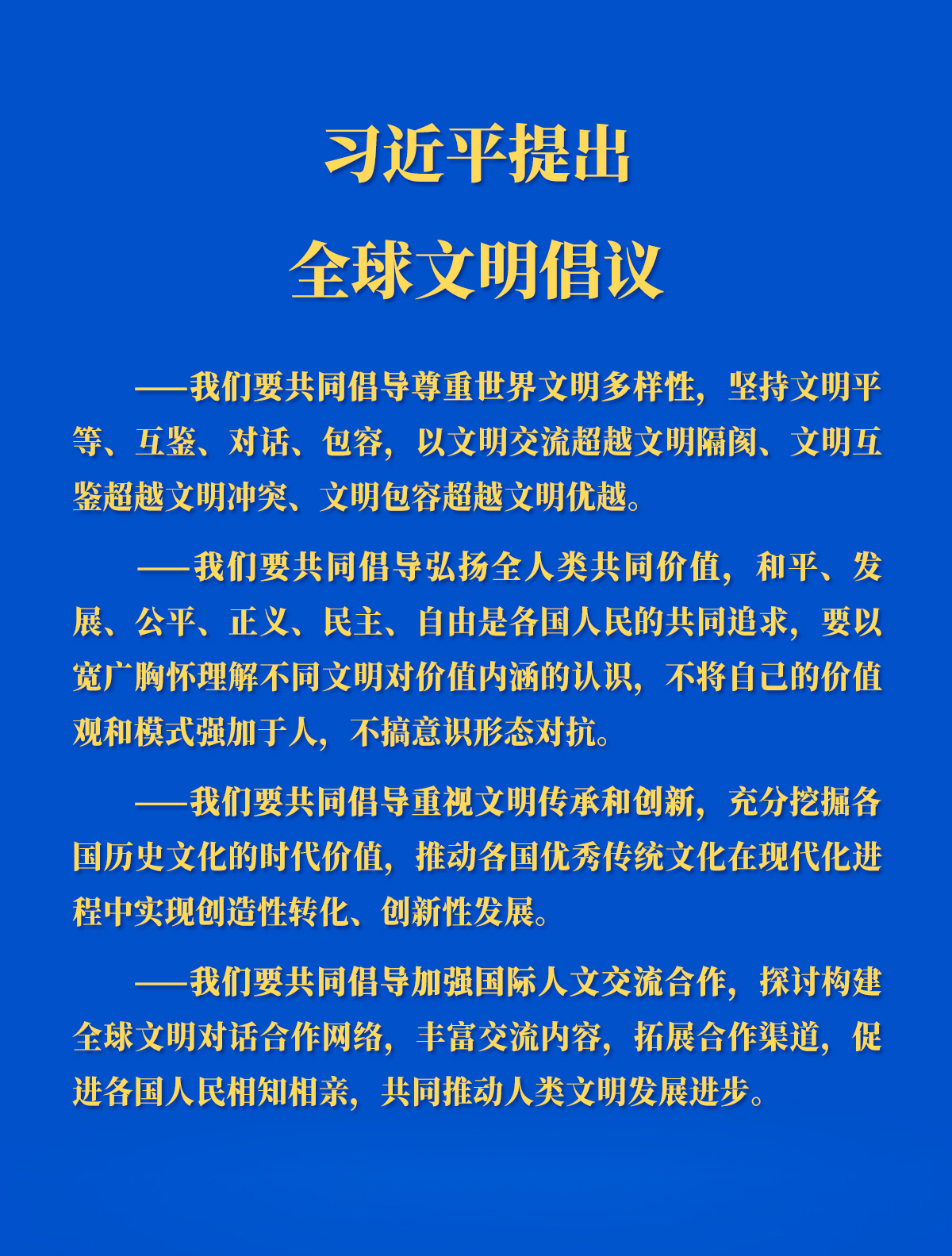 习近平总书记用四个“共同倡导”对全球文明倡议的主要内容进行概括,为推动文明交流互鉴、促进人类文明进步提供中国方案。