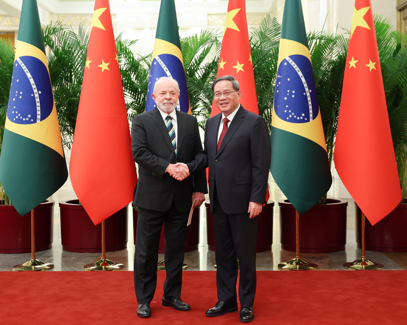 国务院总理李强4月14日下午在人民大会堂会见来华进行国事访问的巴西总统卢拉。