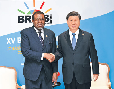 本报约翰内斯堡8月24日电 (记者杨一、时元皓)当地时间8月24日上午,国家主席习近平在约翰内斯堡出席金砖国家领导人会晤期间会见纳米比亚总统根哥布。