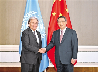 李强指出,今年是习近平主席提出构建人类命运共同体理念和共建“一带一路”倡议十周年。近年来,习近平主席又先后提出全球发展倡议、全球安全倡议、全球文明倡议,为解决全球发展与治理问题提供了中国方案。中国将继续坚定支持联合国在国际事务中发挥核心作用,愿同联合国一道推动构建人类命运共同体。