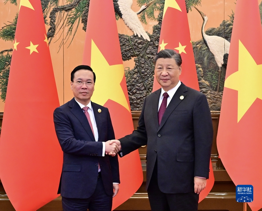 10月20日上午,国家主席习近平在北京人民大会堂会见来华出席第三届“一带一路”国际合作高峰论坛的越南国家主席武文赏。新华社记者 翟健岚 摄