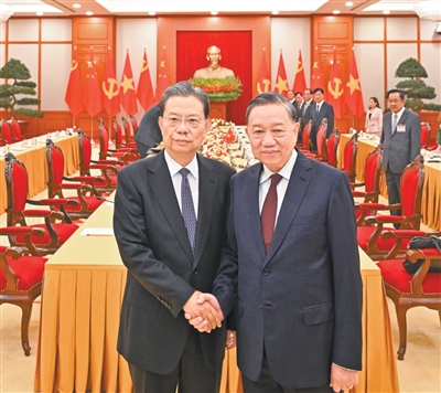 会见苏林时,赵乐际转达习近平总书记的亲切问候,热烈祝贺越南80年来党和国家事业取得的历史性成就,表示新形势下中方愿同越方共同落实好两党最高领导人重要共识,按照“六个更”总体目标,深化治国理政经验交流,加强共建“一带一路”倡议和“两廊一圈”战略对接,拉紧两国人民友好纽带,携手推进各自国家社会主义现代化建设,加快构建具有战略意义的中越命运共同体。