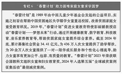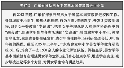 基础教育性别差距基本消除。连续实施4个“学前教育行动计划”,2024年全国在园幼儿中女童为1694.14万,占47.3%。推动义务教育优质均衡发展,加快缩小区域、城乡、校际、群体教育差距,小学学龄女童净入学率保持在99.9%以上,2024年九年义务教育阶段在校生中女生占46.98%。实施高中阶段教育普及攻坚计划(2017—2020年)、“十四五”县域普通高中发展提升行动计划等,女性接受高中教育的比例不断提升,2024年普通高中在校生中女生占49.3%。(见专栏6)