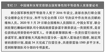 支持妇女参与维护和平与安全。以实际行动落实联合国安理会“关于妇女、和平与安全”决议,支持妇女在预防冲突、和平谈判和家园重建过程中发挥重要作用。2022年,中国—联合国和平与发展基金发起高级女性人才培训项目,促进联合国维和行动中高级别岗位性别平等。中国有维和女官兵1200余名、维和女警100余人次参与医疗保障、联络协调、扫雷排爆、巡逻观察和促进性别平等、妇女保护等工作。(见专栏23)