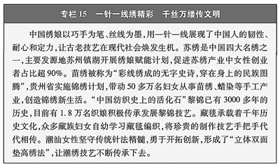 在民族文化“活态”传承中展现优势。妇女通过技艺传承、文化创新与传播等方式为民族文化注入新活力。国家认定的3997名国家级非物质文化遗产代表性传承人中,妇女占25%。“中国非物质文化遗产传承人群研修培训计划”培训学员5.1万人次,其中妇女占57%。开展中国传统工艺振兴计划、非遗助力乡村振兴等专项工作,一大批女性带头人将当地的自然资源、乡土文化资源转化为文化产品和文化产业,贵州“鸽子花·松桃苗绣”、青海“威远土族盘绣”等手工艺品牌如雨后春笋般涌现,“非遗+民宿”“非遗+文创”“非遗+研学”等新业态陆续推出,民族传统文化在妇女手中孕育出新的生命力。数字技术赋能传统文化焕发新活力,越来越多青年女性成为“国潮”热和非遗“活态”传承的中坚力量,使非物质文化遗产以全新姿态融入当代生活、走向世界。(见专栏15)