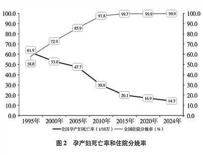 妇女健康水平大幅提高。2020年,妇女平均预期寿命已提高到80.9岁。2012年以来,全国住院分娩率持续稳定在99%以上,孕产妇系统管理率2024年达到94.9%,孕产妇死亡率从1995年的61.9/10万降至2024年的14.3/10万,下降了76.9%,远低于世界平均水平。中国妇幼健康核心指标(孕产妇死亡率、婴儿死亡率、5岁以下儿童死亡率)位居全球中高收入国家前列,提前实现联合国2030年可持续发展议程相关目标,被世界卫生组织列为妇幼健康高绩效的10个国家之一。(见图1、图2)