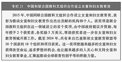 支持联合国发挥核心作用。与联合国妇女署共同举办全球妇女峰会,推动各国履行承诺,为全球妇女事业发展注入新动能。在联合国人权理事会,中国围绕促进和保护妇女权益多次作共同发言,推动通过相关决议,呼吁各国携手落实《北京宣言》和《行动纲领》。持续组派高级别代表团出席联合国妇女地位委员会会议,与联合国组织和相关机构合作,围绕妇女减贫、数字经济、普惠金融、技术赋能、人口变化中的性别平等开展研讨,分享促进妇女发展的中国经验。2015年以来,中国向联合国妇女署捐款2000万美元,与联合国多个专门机构开展妇女领域务实合作,同联合国教科文组织合作设立女童和妇女教育奖,在非洲开展女童数字教育、健康教育等项目。中国妇女在联合国系统担任要职、专家,为促进妇女领域全球治理贡献智慧。(见专栏21)