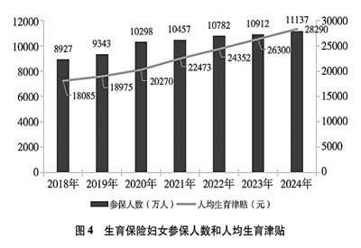 妇女生育保障水平明显提升。全面推进生育保险和职工医保合并实施,持续推进生育保险用人单位参保,逐步拓展生育保险覆盖面,指导有条件的地方将灵活就业人员纳入生育保险覆盖范围,失业人员在领取失业保险金期间,生育保险费由失业保险基金代缴,未就业妇女通过参加城乡居民基本医疗保险享受生育医疗待遇。截至2024年底,生育保险妇女参保人数达1.11亿。31个省(区、市)和新疆生产建设兵团均将适宜的辅助生殖项目纳入医保。(见图4)